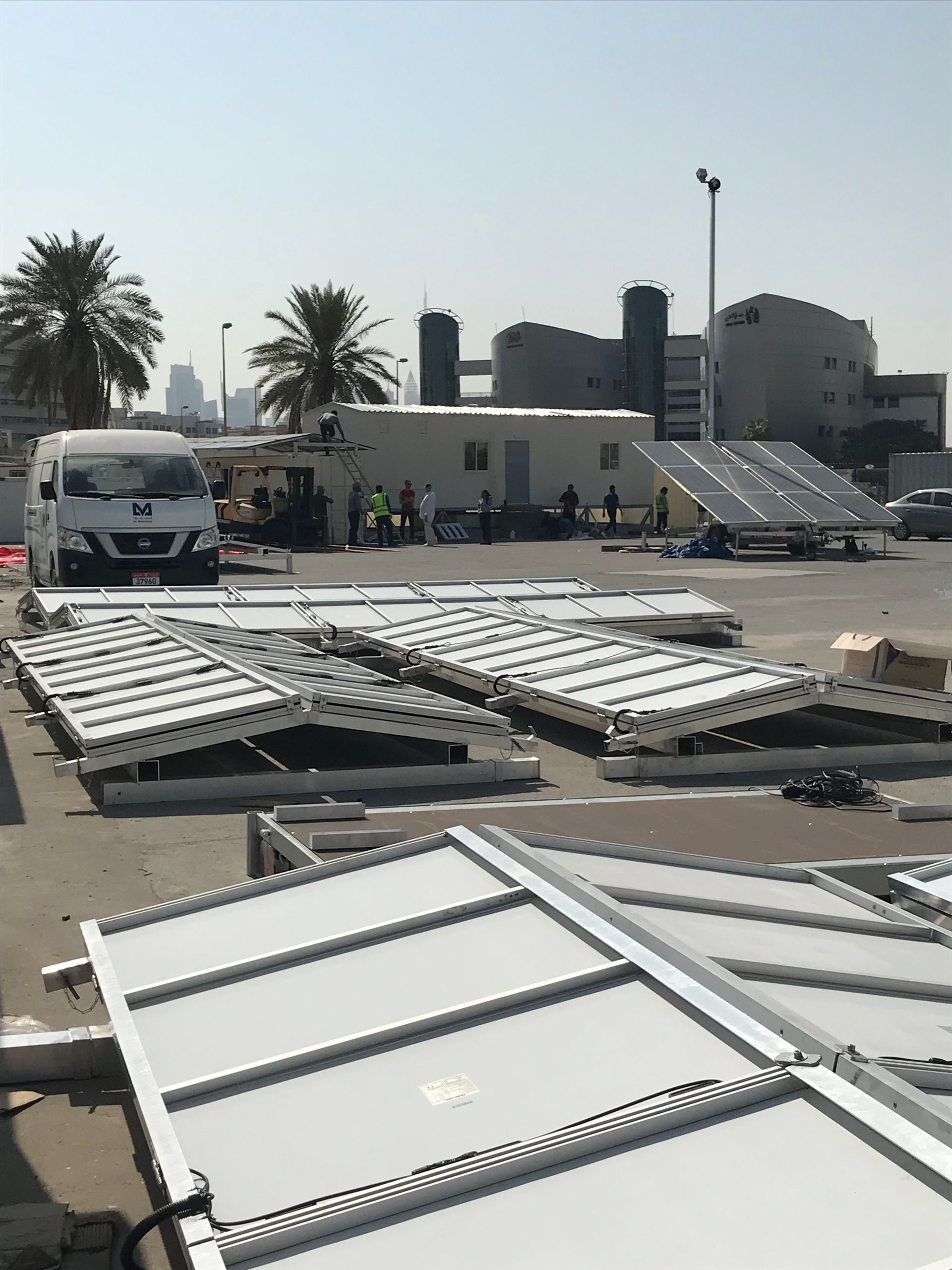 e-GROUNDBOX trailer: a ready-to-assemble system coming on a single trailer with 72 glassless flex panels, 14 PVC boxes and a movable e-NERGYBOX (conversion & storage system)